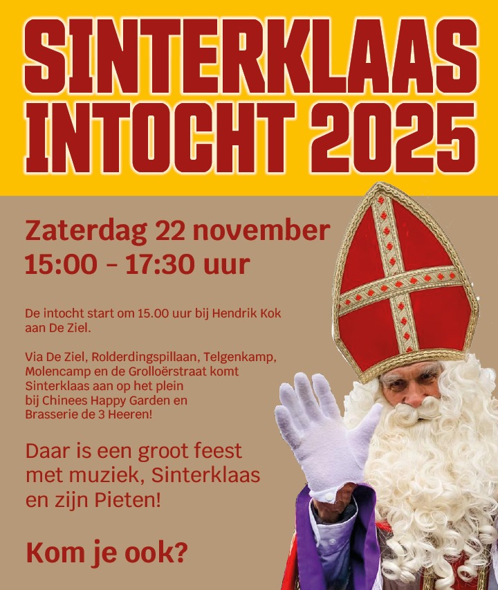 Vandaag komt Sinterklaas naar Rolde! De intocht start om 15.00 uur bij Hendrik Kok en eindigt rond 15.45 uur in het centrum met een vrolijke pietendisco en muziek van Crescendo Grolloo.