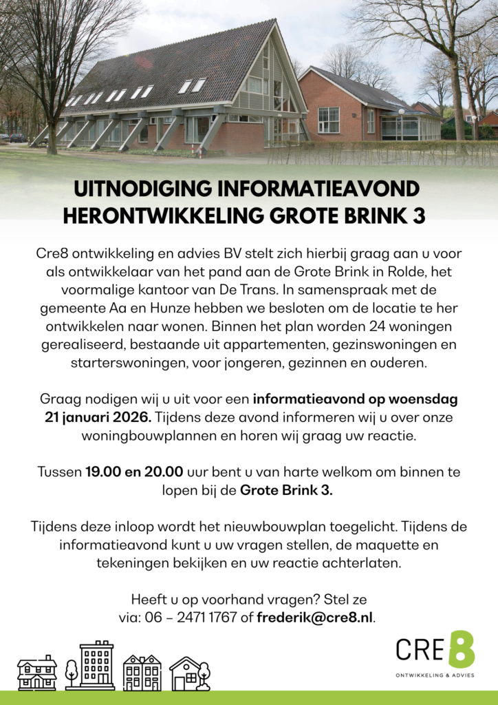 Op woensdag 21 januari 2026 organiseert Cre8 Ontwikkeling en Advies B.V. een informatieavond over de herontwikkeling van het pand aan de Grote Brink 3 in Rolde. Het gebouw heeft een lange en herkenbare geschiedenis in het dorp.