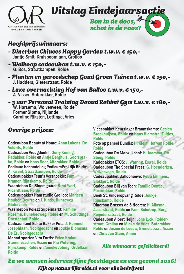 De eindejaarsactie van de Ondernemersvereniging Rolde en omstreken is ook dit jaar weer zeer succesvol verlopen. Inwoners uit Rolde en omgeving leverden massaal hun kassabonnen in, wat resulteerde in een forse stapel bonnen én 38 prijzen die werden verloot.