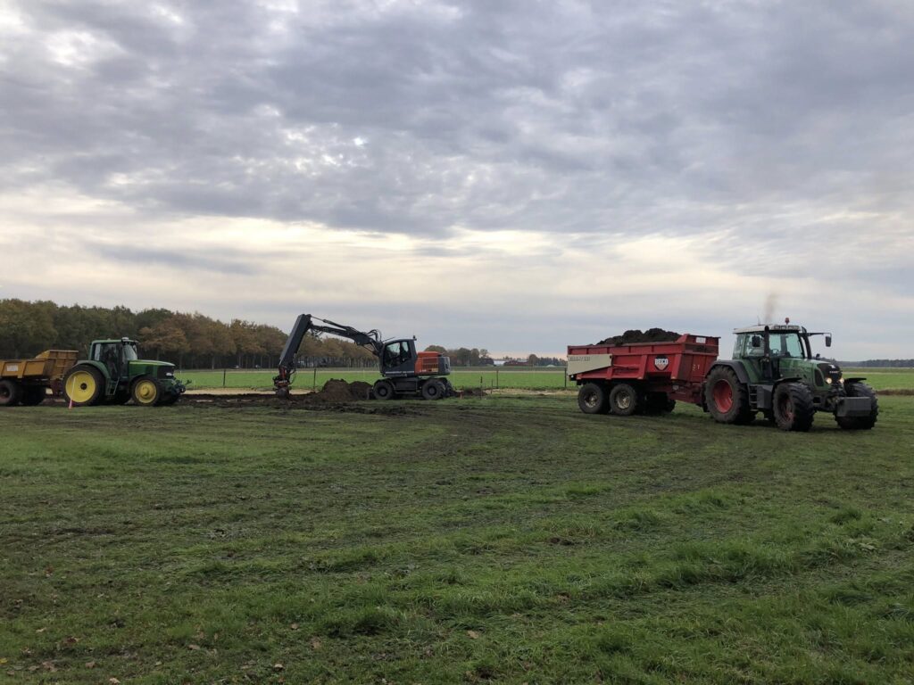 De bouw wordt grotendeels in eigen beheer uitgevoerd. Zo is lokale kraanmachinist Adri van Assem druk bezig om het terrein bouwrijp te maken. “Het is mooi om na al die plannen en vergunningen eindelijk te kunnen beginnen,” vertelt Margé Emmens, mede-eigenaar van Topgazon. Samen met man Arnout Weuring en broer Arwolt Emmens runt zij het bedrijf, dat al jaren bekendstaat als leverancier van Drentse graszoden.