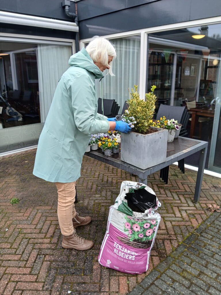 Rondom De Wenning werd flink gewerkt om de buitenruimte weer op te frissen. Zo werden plantjes in potten gezet en oud tuinmeubilair en verouderde plantenbakken verwijderd. Ook de terrassen kregen een opknapbeurt: onkruid werd verwijderd en alles werd netjes geveegd.