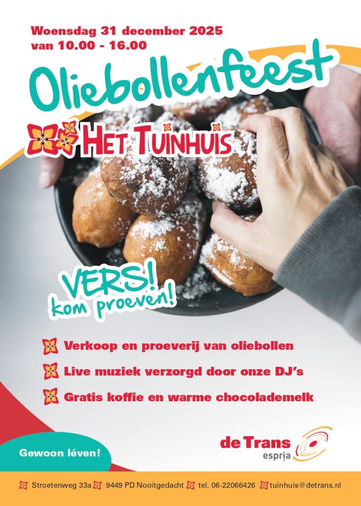 Tijdens het Oliebollenfeest kan iedereen (ja iedereen) oliebollen komen proeven en kopen op Het Tuinhuis. Er wordt gratis koffie, warme chocolademelk en thee geschonken en we maken er met z’n allen een gezellig feestje van onder het genot van een gezellig stukje muziek! Kortom een feestelijke afsluiting van het jaar!